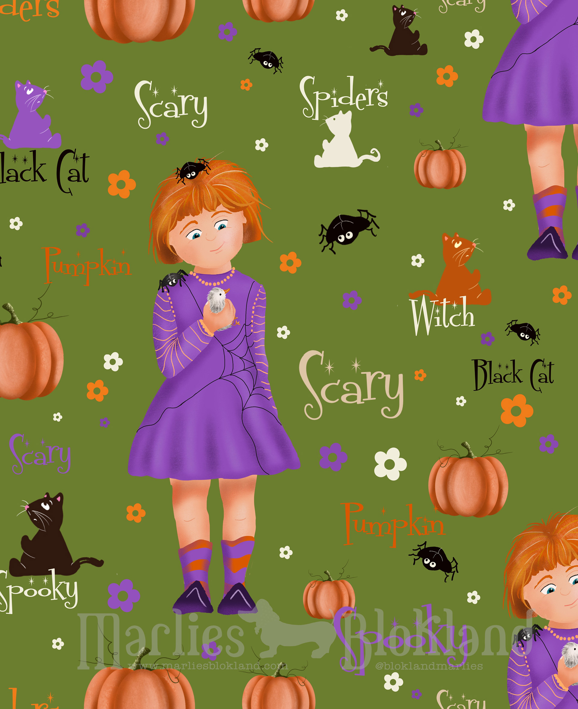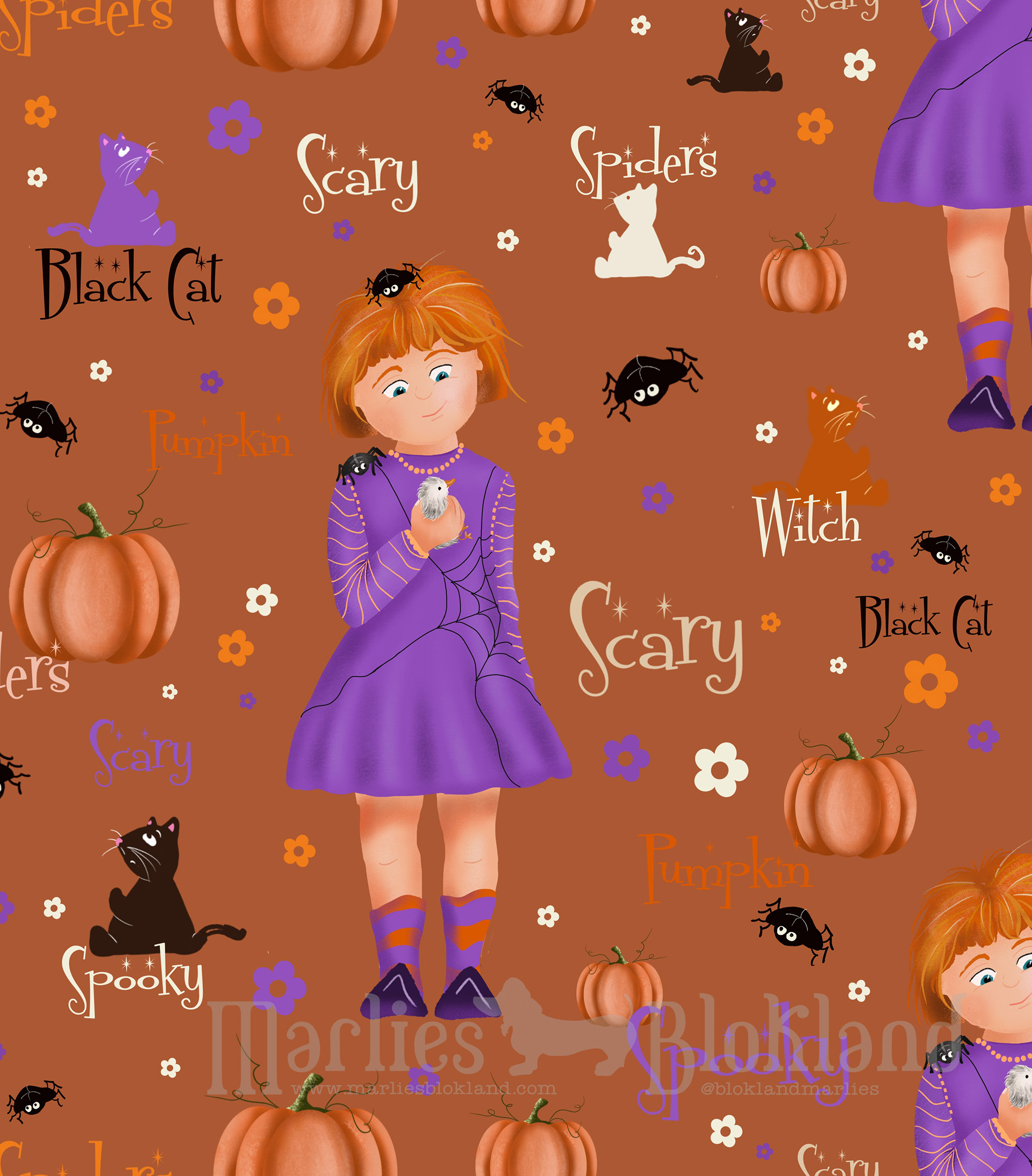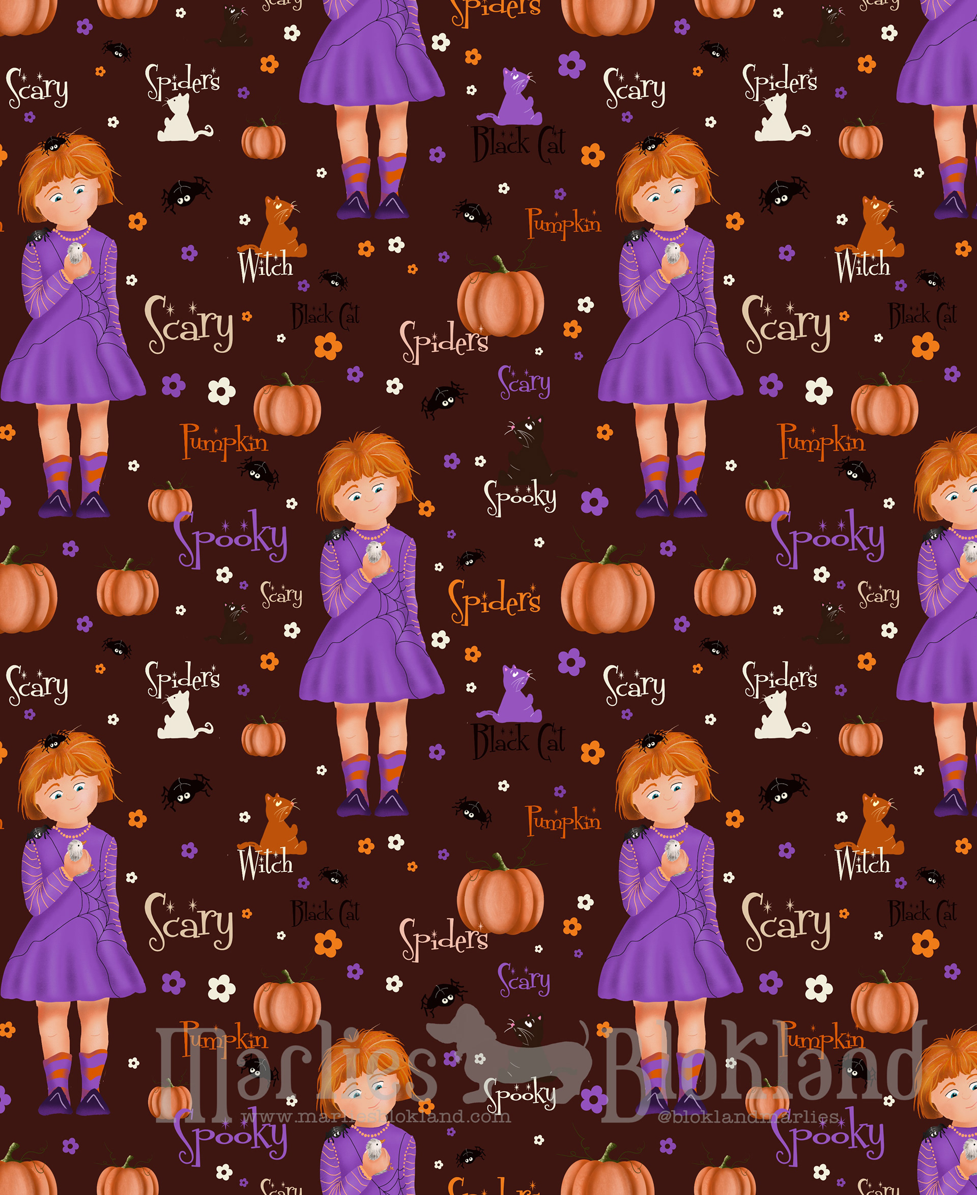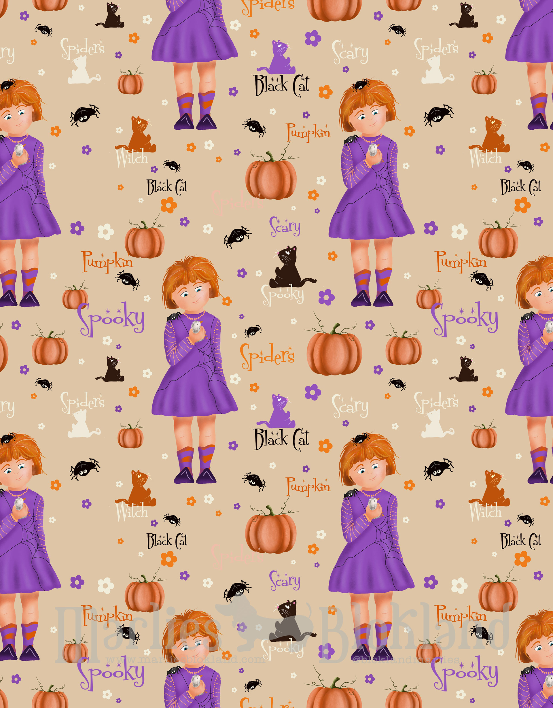 Celebrate Spooky Times with a playful Halloween pattern full of witches, pumpkins and friendly spiders! Designed for the kids market, this whimsical print brings cozy autumn magic to childrenâs products, from tumblers to apparel. A cheerful, story-driven surface design in a Halloween vibe !